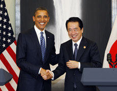 <President Obama shakes hands with Japanese PM Kan on the sidelines of the APEC Summit. (Yuriko Nakao/Courtesy Reuters)>